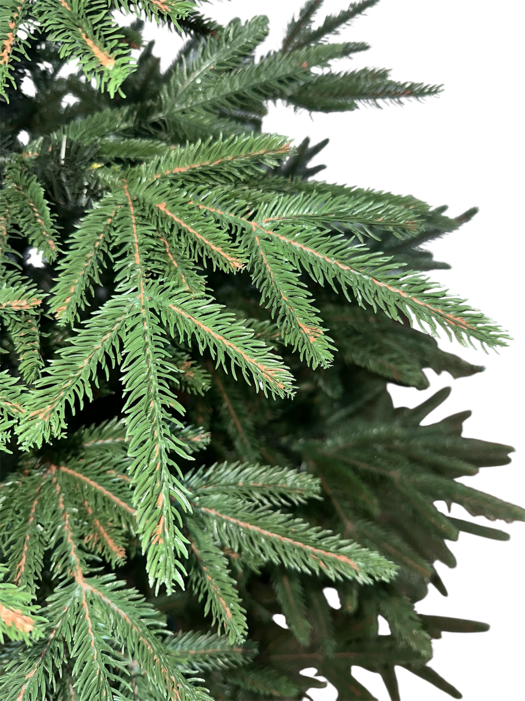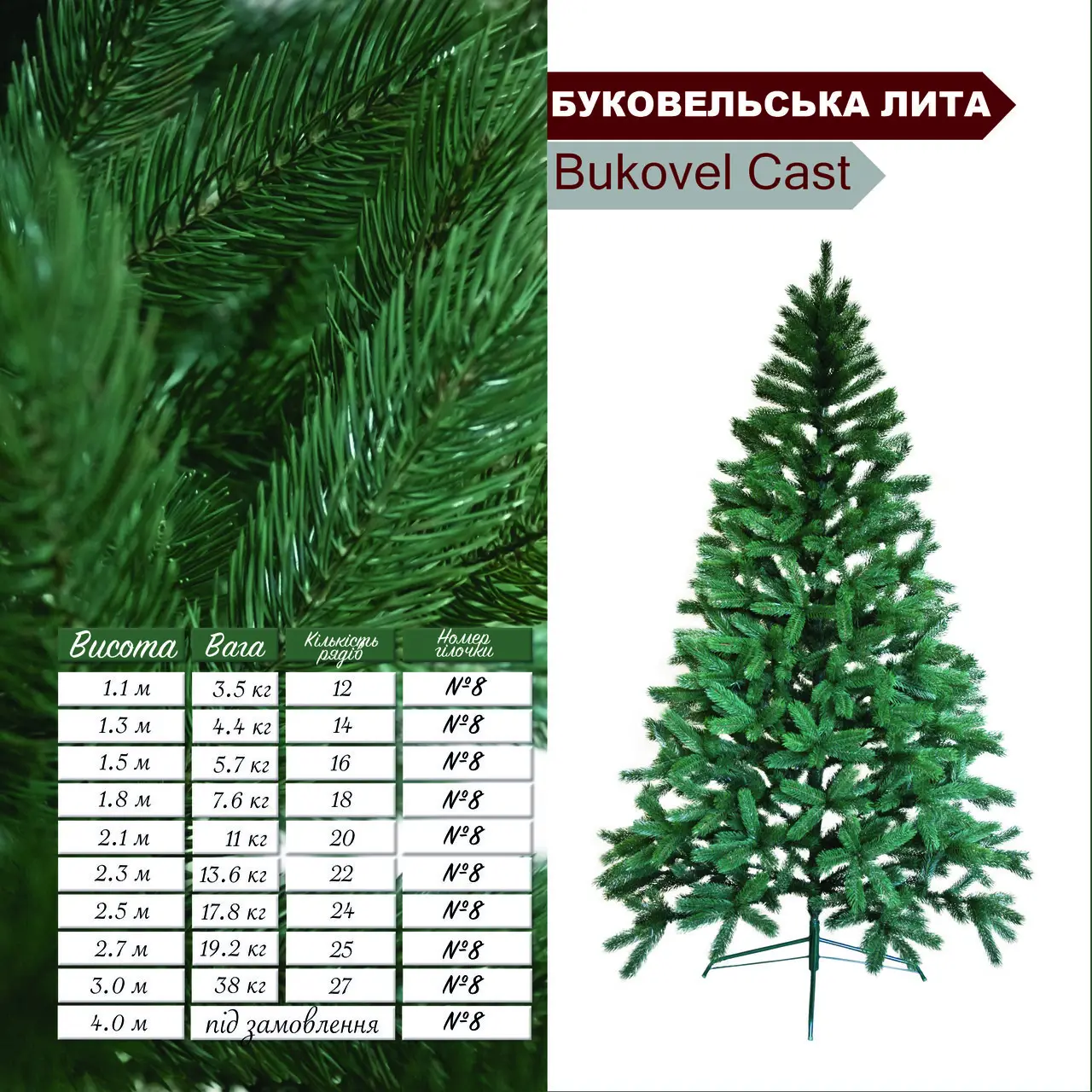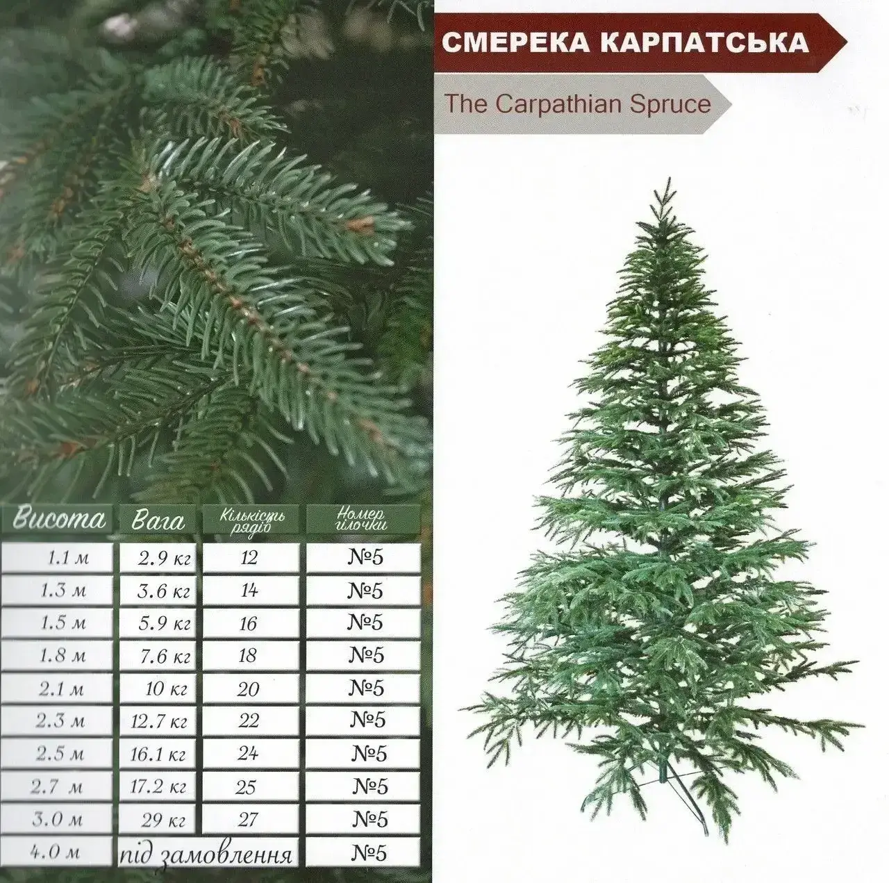 Штучна ялинка Карпатська — витончена, пишна й максимально схожа на справжню. Виготовлена з литих гілок первинної сировини, без запаху та гіпоалергенна. Пружні гілочки і металева конструкція забезпечують природний вигляд і довговічність.