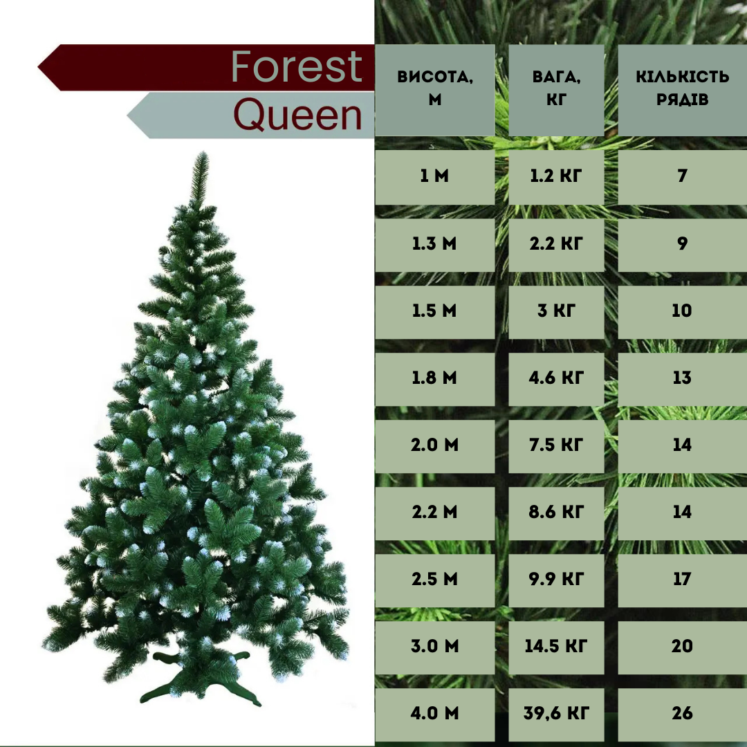 Штучна ялинка "Королева лісу" виготовлена у відповідності з санітарно-епідеміологічними і гігієнічними вимогами до продукції в Україні. Зроблена з високоякісних матеріалів. Стовбур представлений зїднованною конструкцію, гілки складаються з дротяного каркасу, який відрізняється високою гнучкістю і міцністю. Голки виготовлені за новими технологіями з ПВХ.